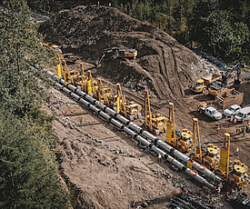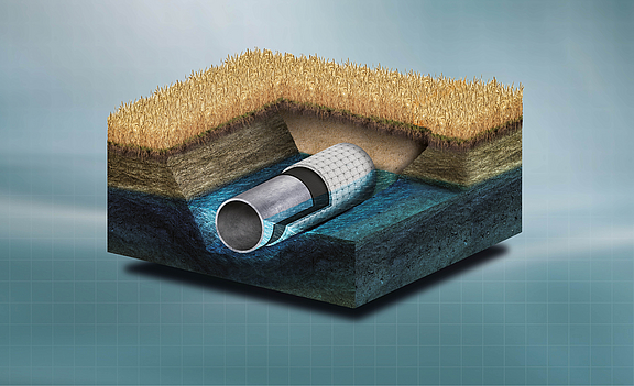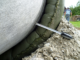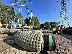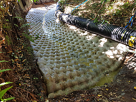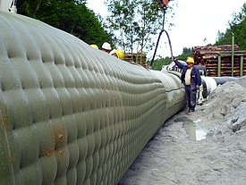 Factory-prefabricated geotextile formwork eliminates the need for time-consuming on-site formwork. In addition, the rapid assembly of custom-made elements and the optimized concreting process enable faster construction progress. With proper planning and assembly, pipe curvatures and varying pipe diameters can be easily encased