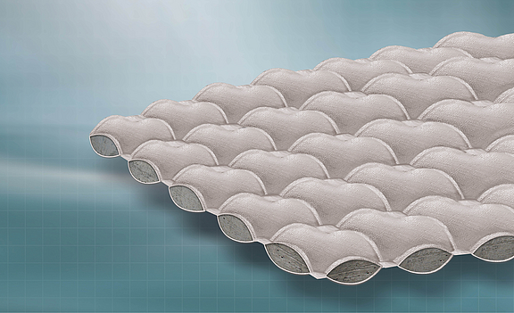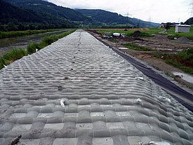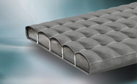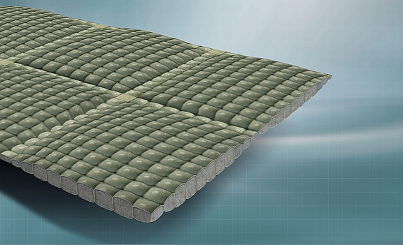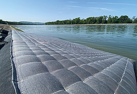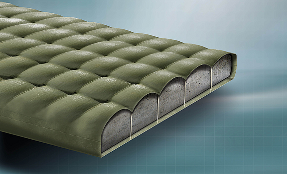 Incomat Flex consists of individual units ("cushions") connected by joining strips. The taper in the web area acts as a predetermined breaking line, while woven-in filter points at the cushion corners help relieve hydrostatic pressure beneath the revetment. The tapered connecting strips give the mattress a certain two-dimensional flexibility in the event of subsidence in the subsoil or if the mattress is washed out.