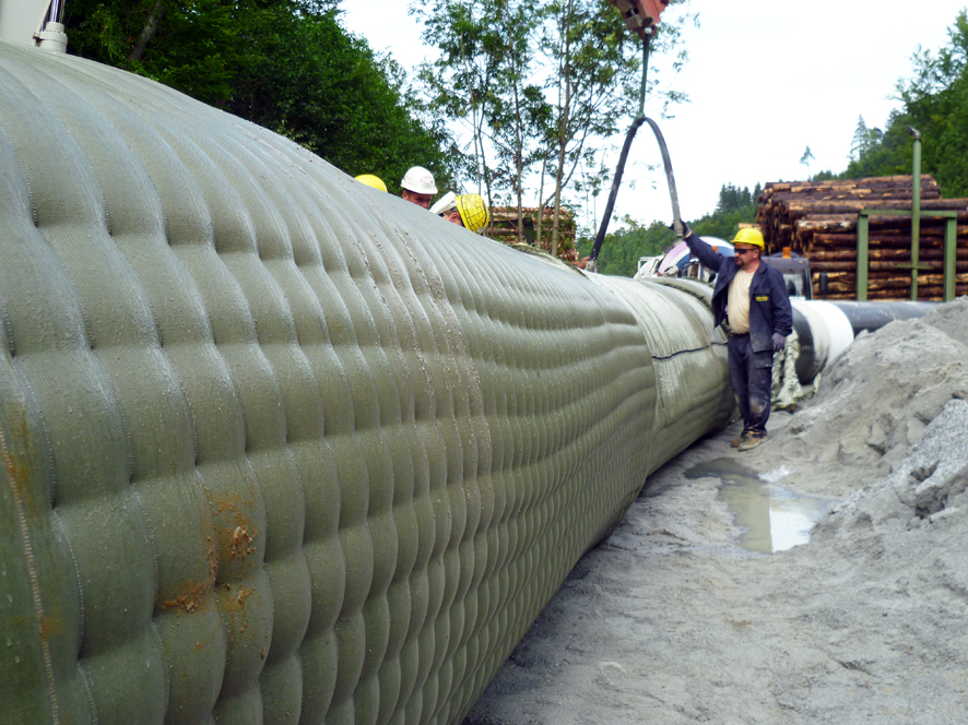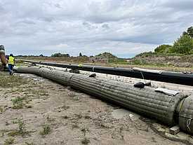 Factory-prefabricated geotextile formwork eliminates the need for time-consuming on-site formwork. In addition, the rapid assembly of custom-made elements and the optimized concreting process enable faster construction progress. With proper planning and assembly, pipe curvatures and varying pipe diameters can be easily encased