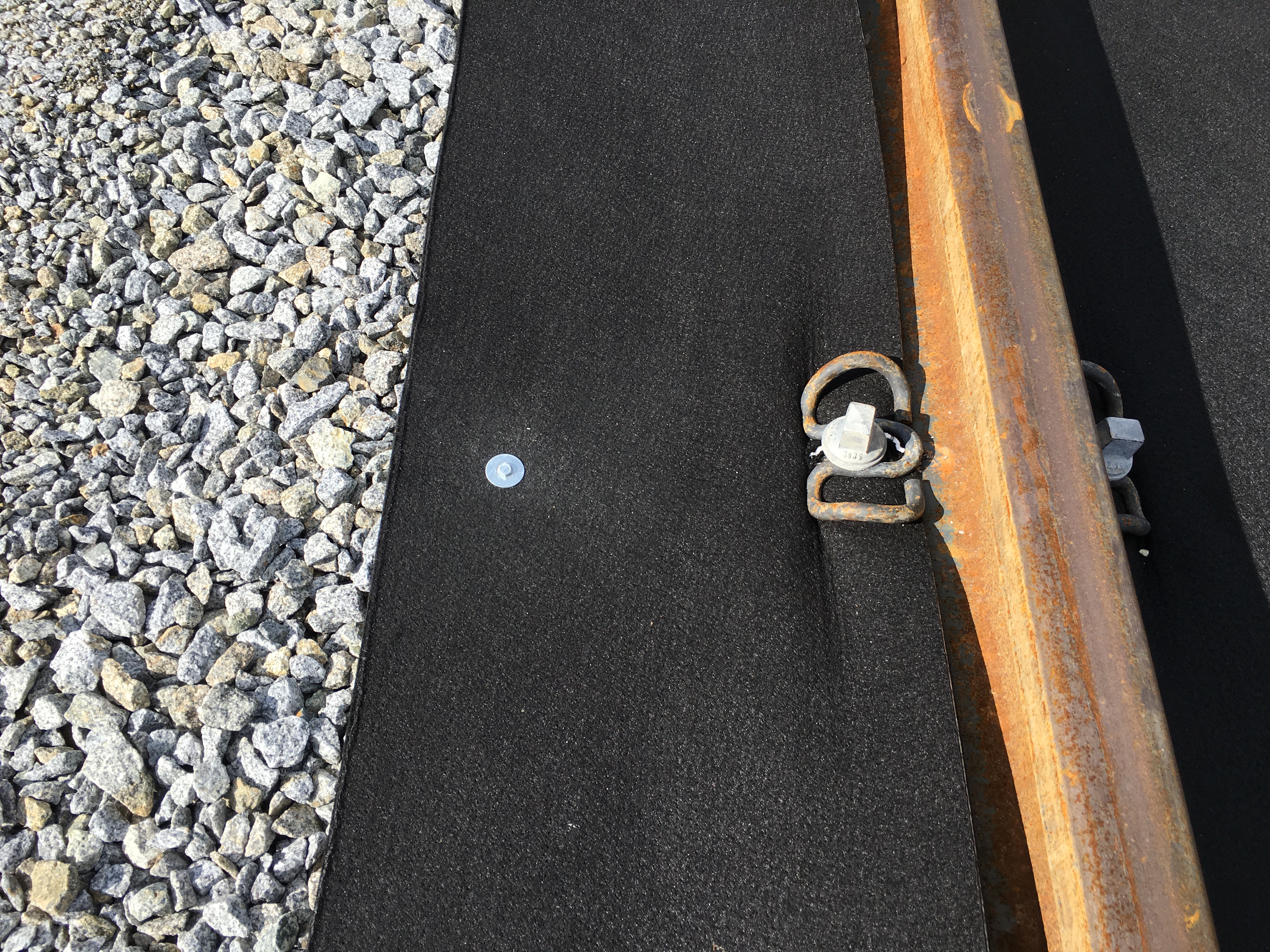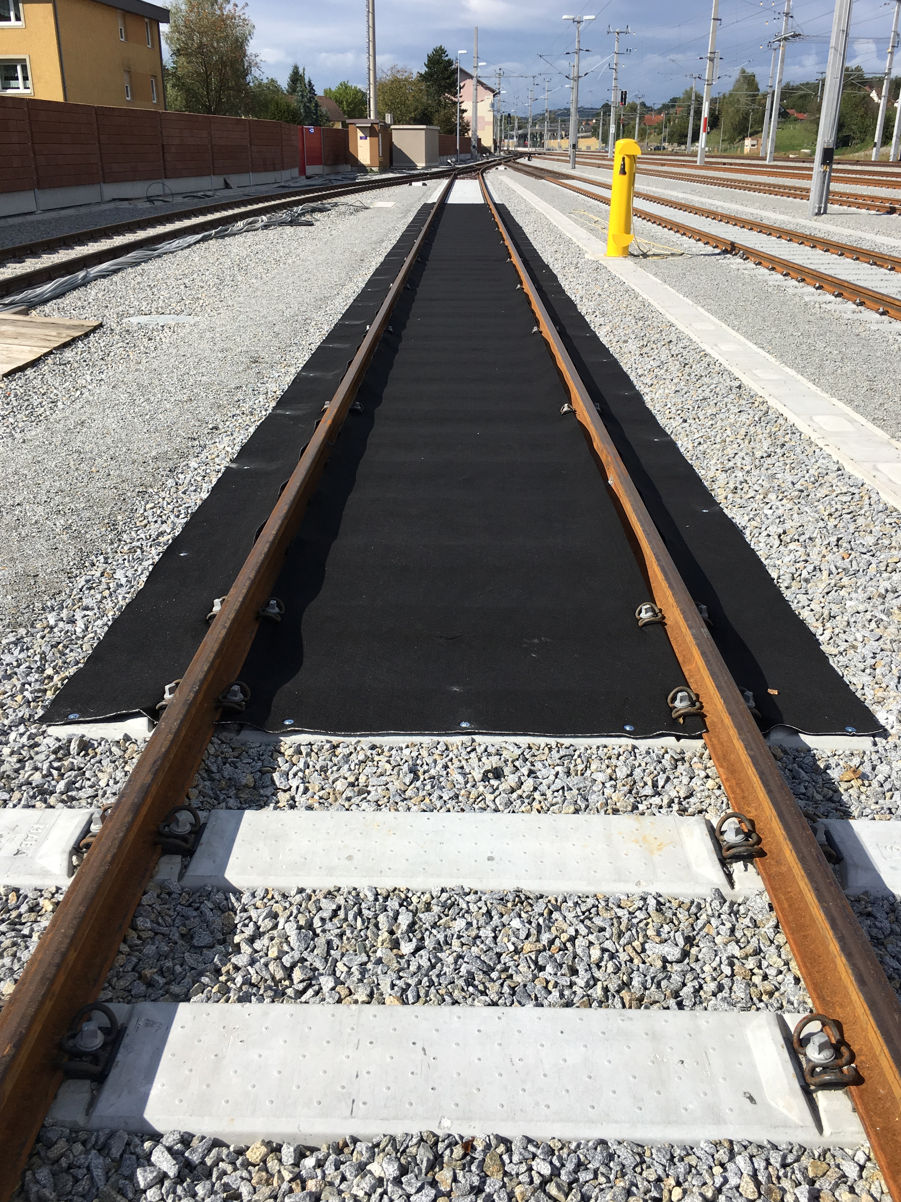 In order to significantly reduce the danger of contamination a active geocomposite was installed at the Austrian Railway (ÖBB) station in Schärding as preventing measure. The geocomposite was fixed to the sleepers so that any grease and oil could be absorbed by the active layer, preventing contamination below. For a quick and easy installation the material was delivered in units of three rolls. One roll with a total width of 1.40 m and two rolls with 0.35 m width. The rolls only had to be unrolled and fixed to the sleepers on site.