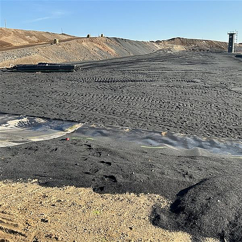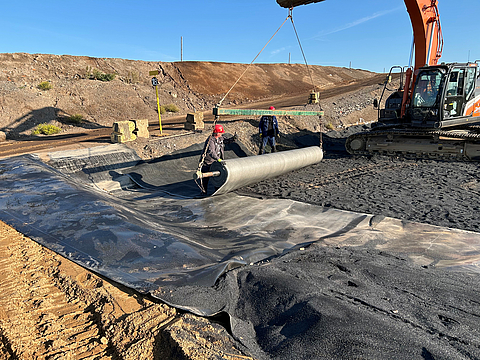 Tektoseal® Active PFAS was used as the central barrier. The leaching PFAS are reliably removed from the leachate via ion exchange and adsorption and permanently bound within the geotextile. The dedicated area is base-sealed with a plastic sealing membrane (KDB) and features a separate leachate collection system that directs the leachate in a controlled manner into a sampling shaft. Regular monitoring takes place there to document the system’s effectiveness. The planned area covers a total of around 5,000 m² and is expected to be backfilled to a height of approximately 10 m. The special active mats were laid directly onto one of the welded plastic waterproofing membranes. A total of 28 rolls of Tektoseal Active PFAS 3000 AI WB (5.10 × 40 m) were installed in a roof-shingle pattern with a 25 cm overlap and immediately backfilled with 30 cm of slag to secure them against the wind. The work was carried out by the construction company Schwind-Bau from Leverkusen under the technical supervision of HUESKER.