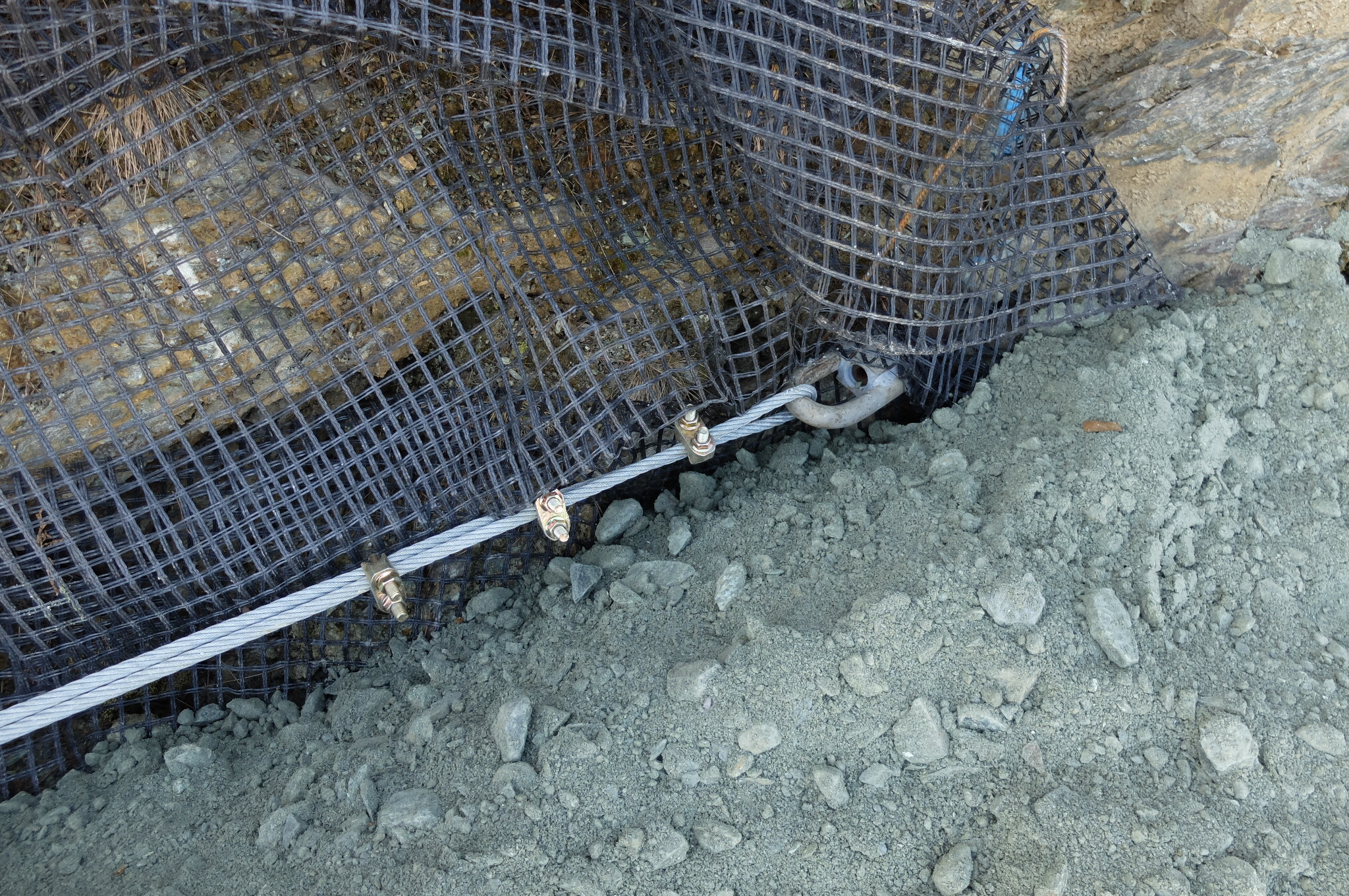 Before construction began, the rock face was prepared by removing loose stones and debris, and a level area was created at the base of the GRS structure in order to ensure a stable bearing surface. To prevent subsequent heaving of the earth structure, geogrids were back-anchored at regular intervals into the natural rock formation by means of steel cables installed in the rock.