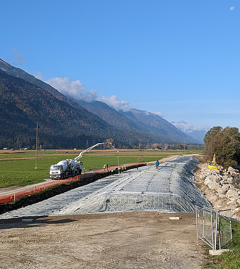 The Gailtal valley in Austria was repeatedly exposed to flooding and high water. To protect the region, a floodable dam area was built, among other things. Our Incomat geotextile concrete mat was used here, which significantly reduces the risk of failure of dykes and dams in the event of flooding. This innovative solution protects against internal erosion processes and offers an environmentally friendly alternative to conventional rockfill. This not only results in significant savings in transport costs and emissions, but also speeds up project completion.